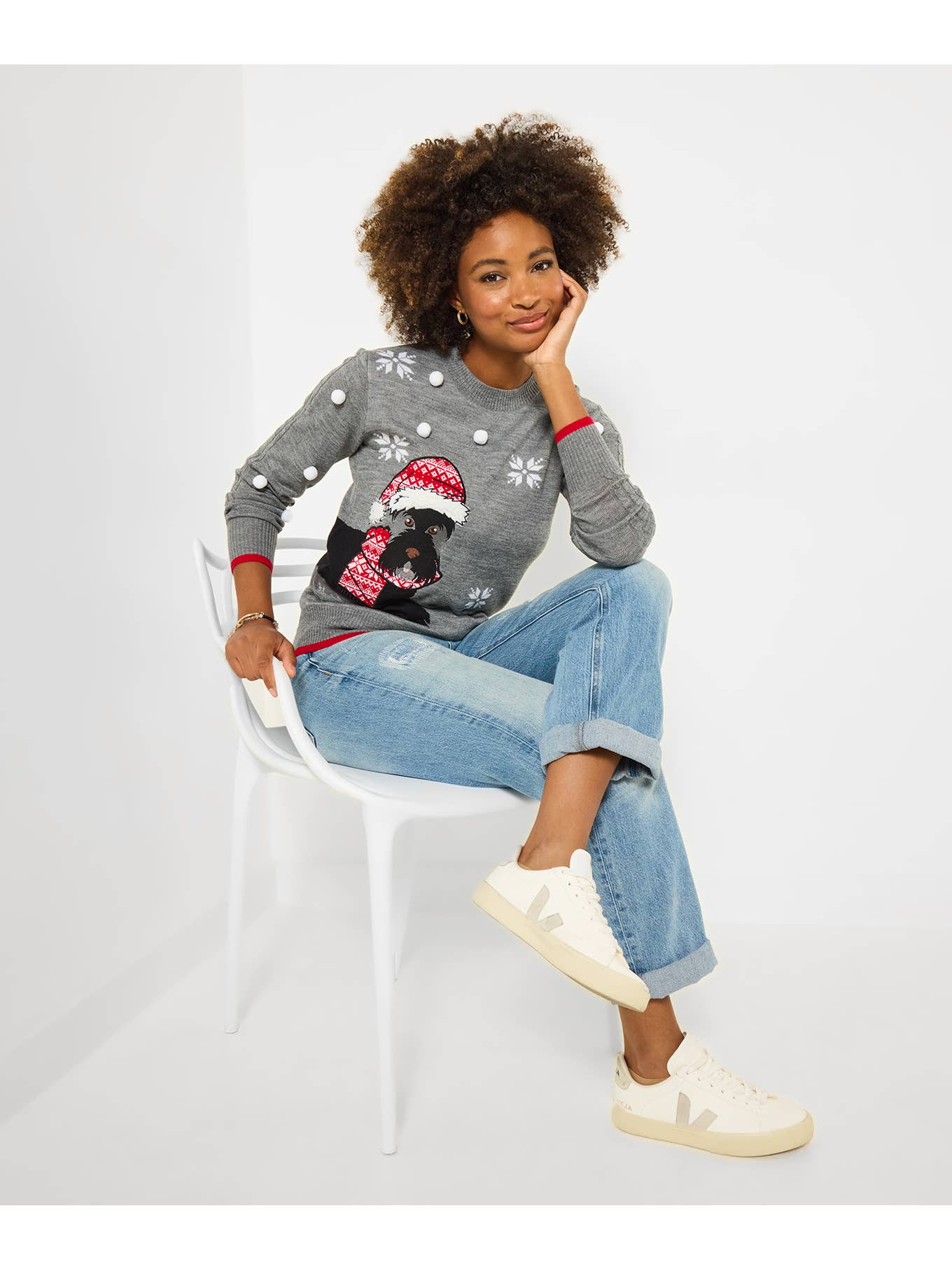 Fine-knit jumper *Classic crew neckline *Long sleeves with dropped shoulders *Scottie dog embroidery with a contrasting red hem *Fun bobbles and snowflakes *Flattering regular fit