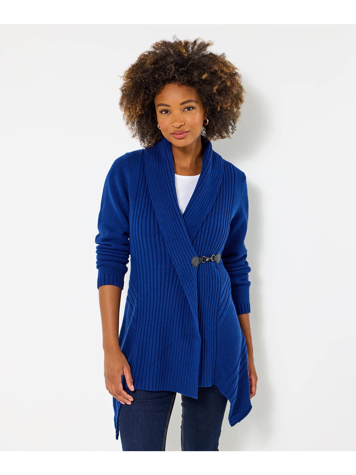 *Bold and beautiful blue *super cosy cardigan with statement buckle fastening *long sleeves and shawl collar ensure you're look chic whilst staying warm * asymetric hem to create unique shape