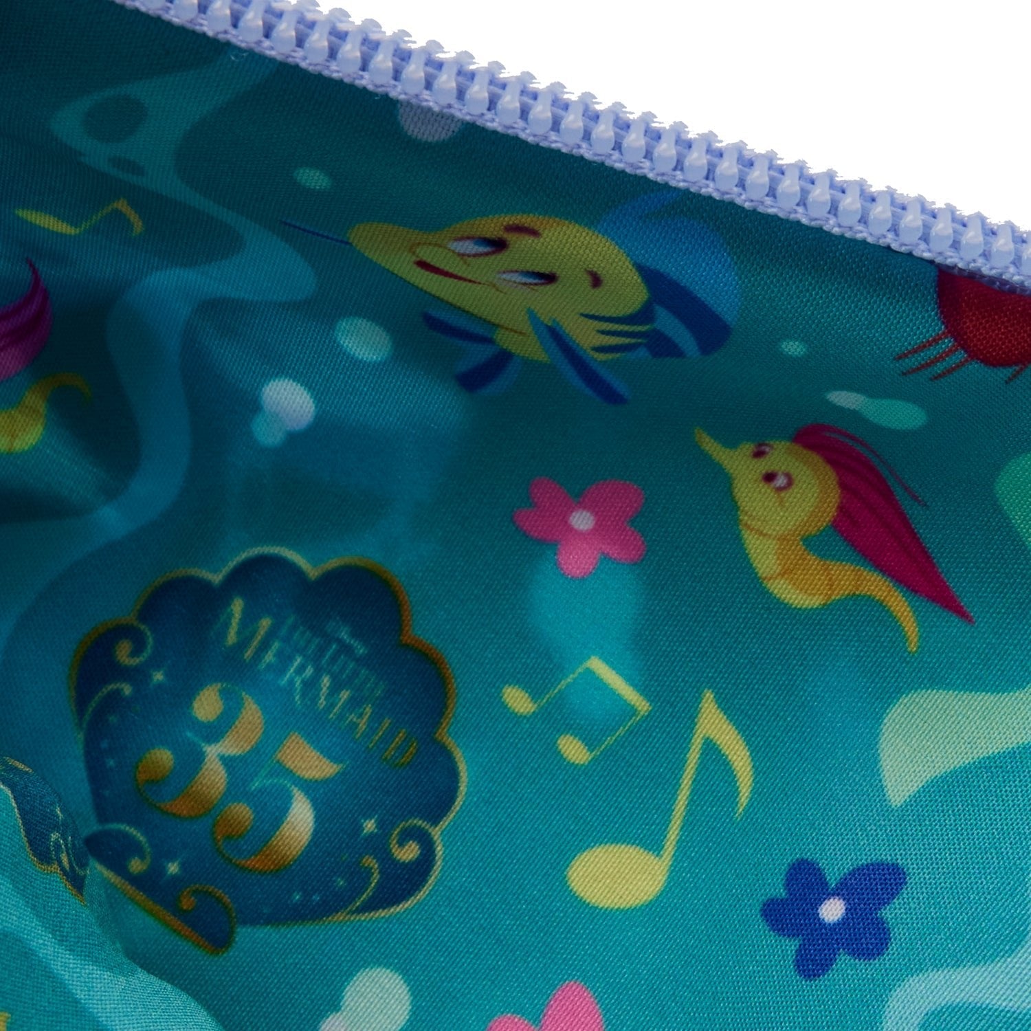 The Loungefly Disney The Little Mermaid 35th Anniversary “Life is the Bubbles” All-Over-Print Nylon Wristlet Wallet is made of nylon. Wallet zips closed with gold-coloured metal hardware. Additional features include printed details. Take note of the coordinating inside lining.