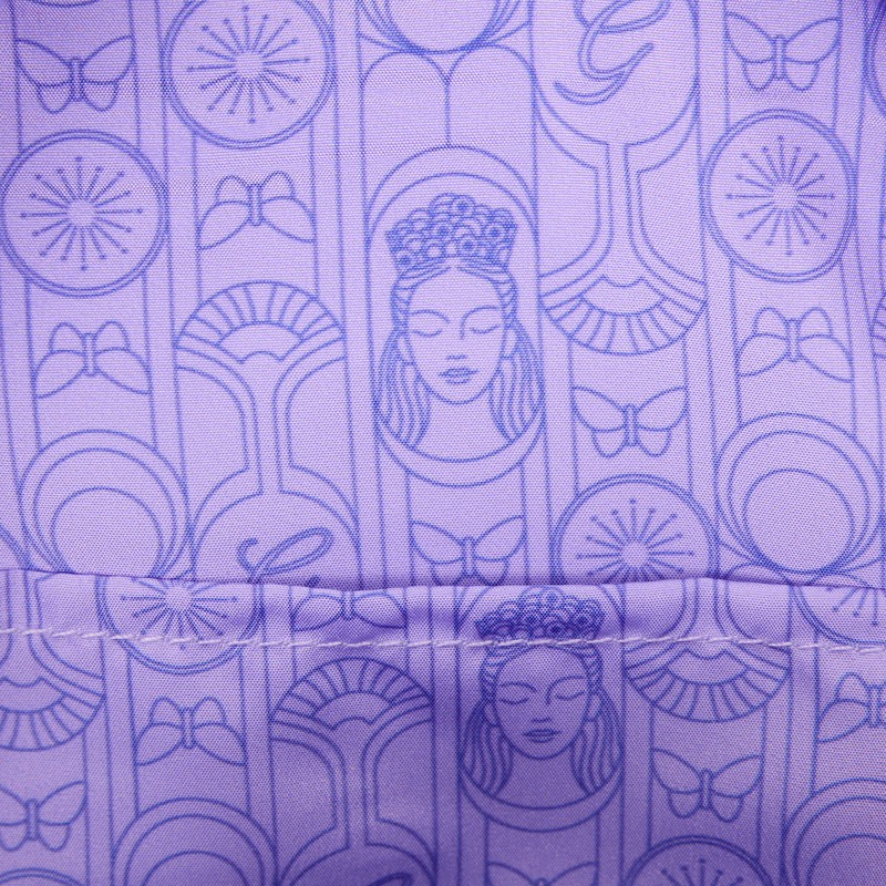 This gorgeous mini backpack features pearlescent faux leather with elegant details, including silver foil, rhinestones, and raised tonal embroidery. Over the front pocket, you'll find a clear PVC bubble with Glinda inside it! Butterflies and swirling silver designs cover the bag. The straps feature a debossed pattern of butterflies.