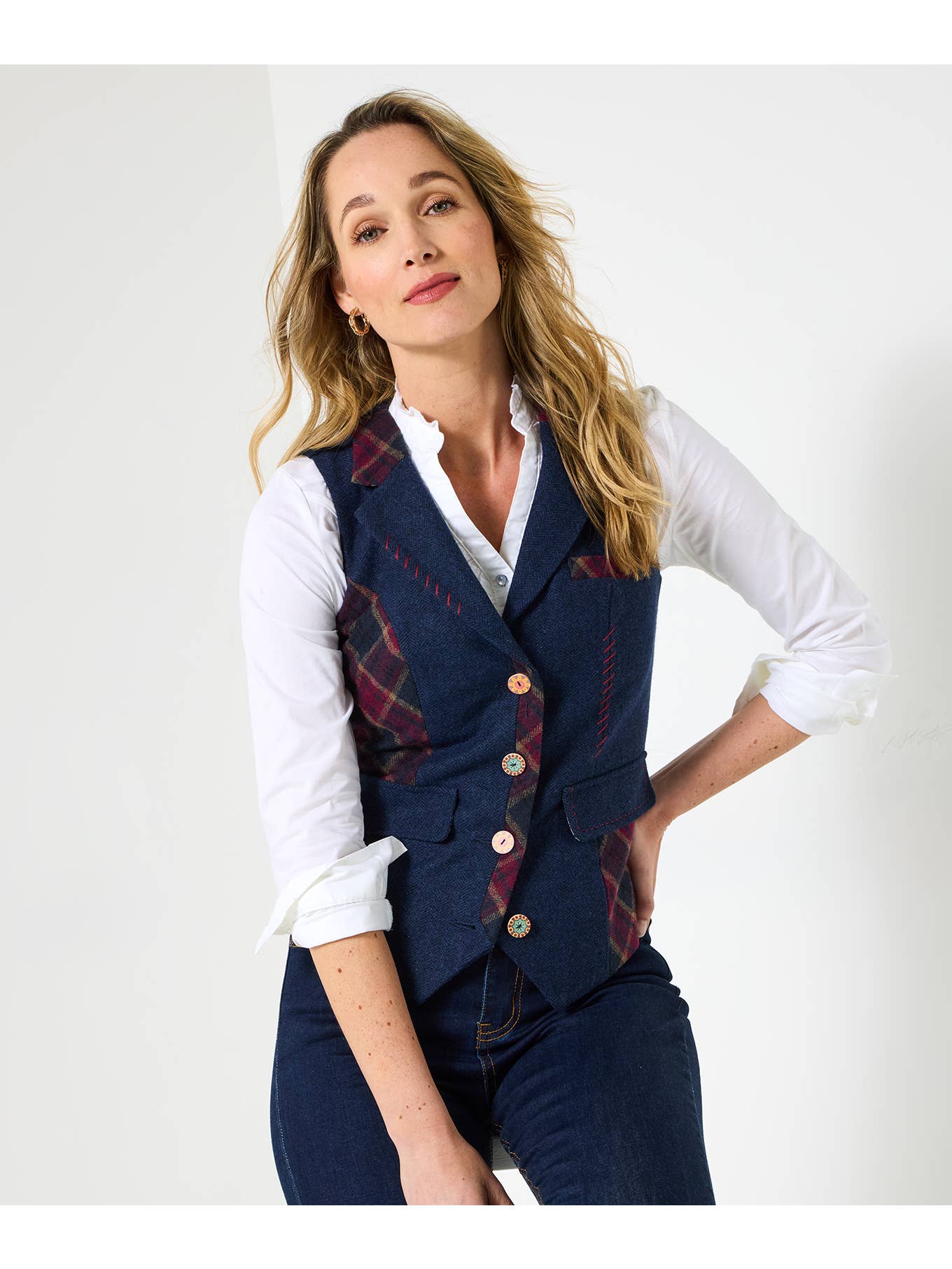 New colour for the new season, women's waistcoat, classic blue colourway, striking check panels, blanket stitch detail, four unique buttons for fastening, handy pockets