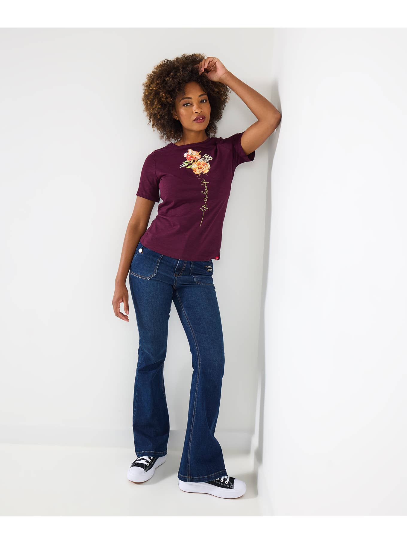 Soft and breathable cotton material *classic crew neck *regular fit *short sleeves *unique graphic layout with floral print and text *rich berry colour adds warmth to transitional styling